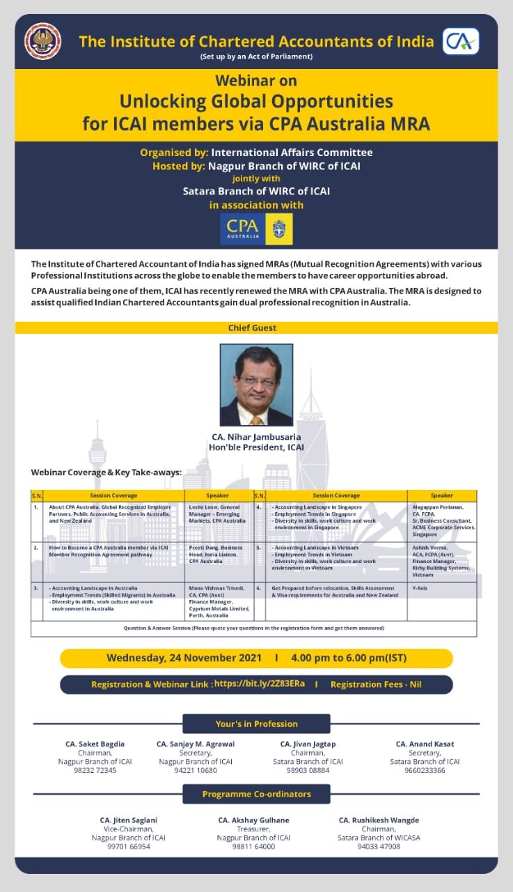 To understand various aspects of MRA and to further decode the various opportunities for members at countries such as Australia, Vietnam & Singapore, International Affairs Committee of ICAI has organized a webinar hosted jointly by Nagpur & Satara Branches with CPA Australia on the topic with expert speakers recognized worldwide, the details of which are stated below -